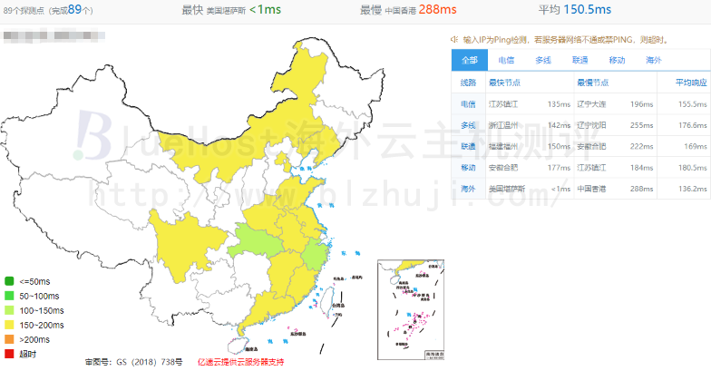 BlueHost美国机房PING值延迟测试: